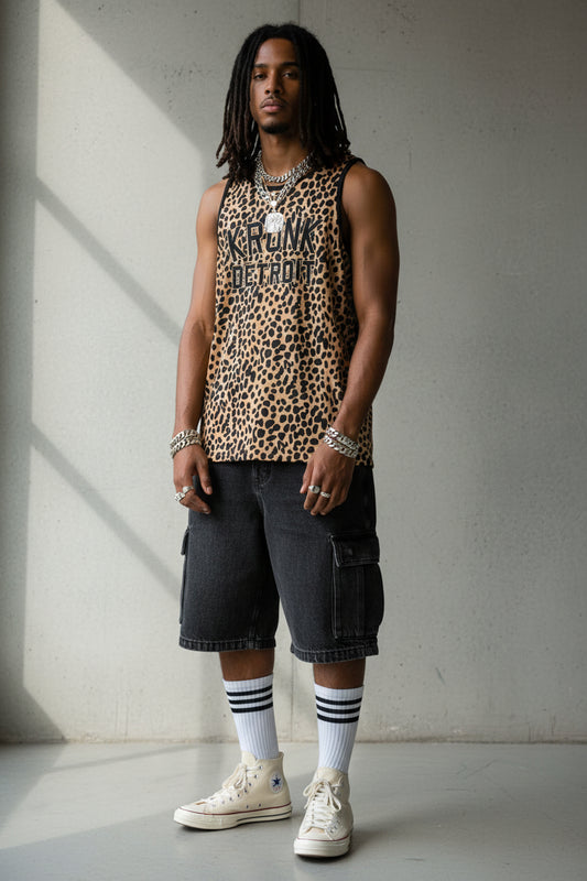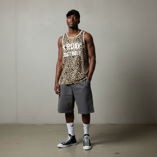 KRONK Iconic Detroit Applique Training Gym Vest Leopard Print Black