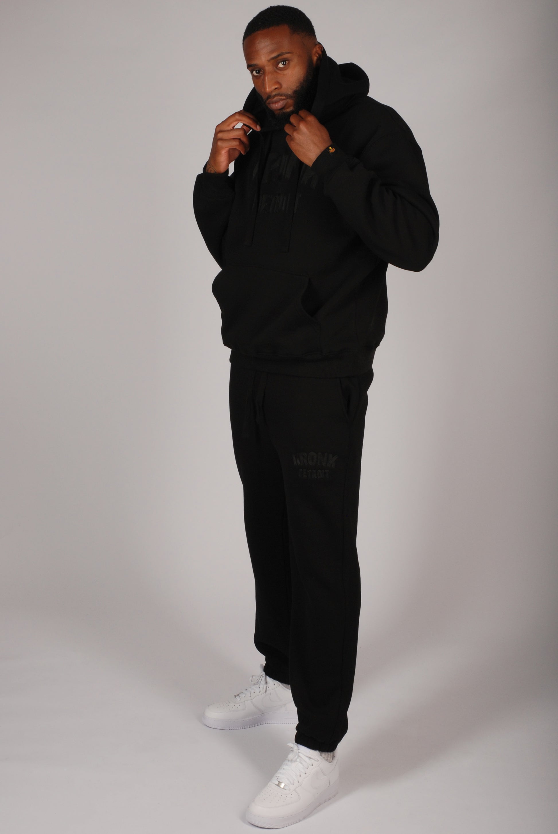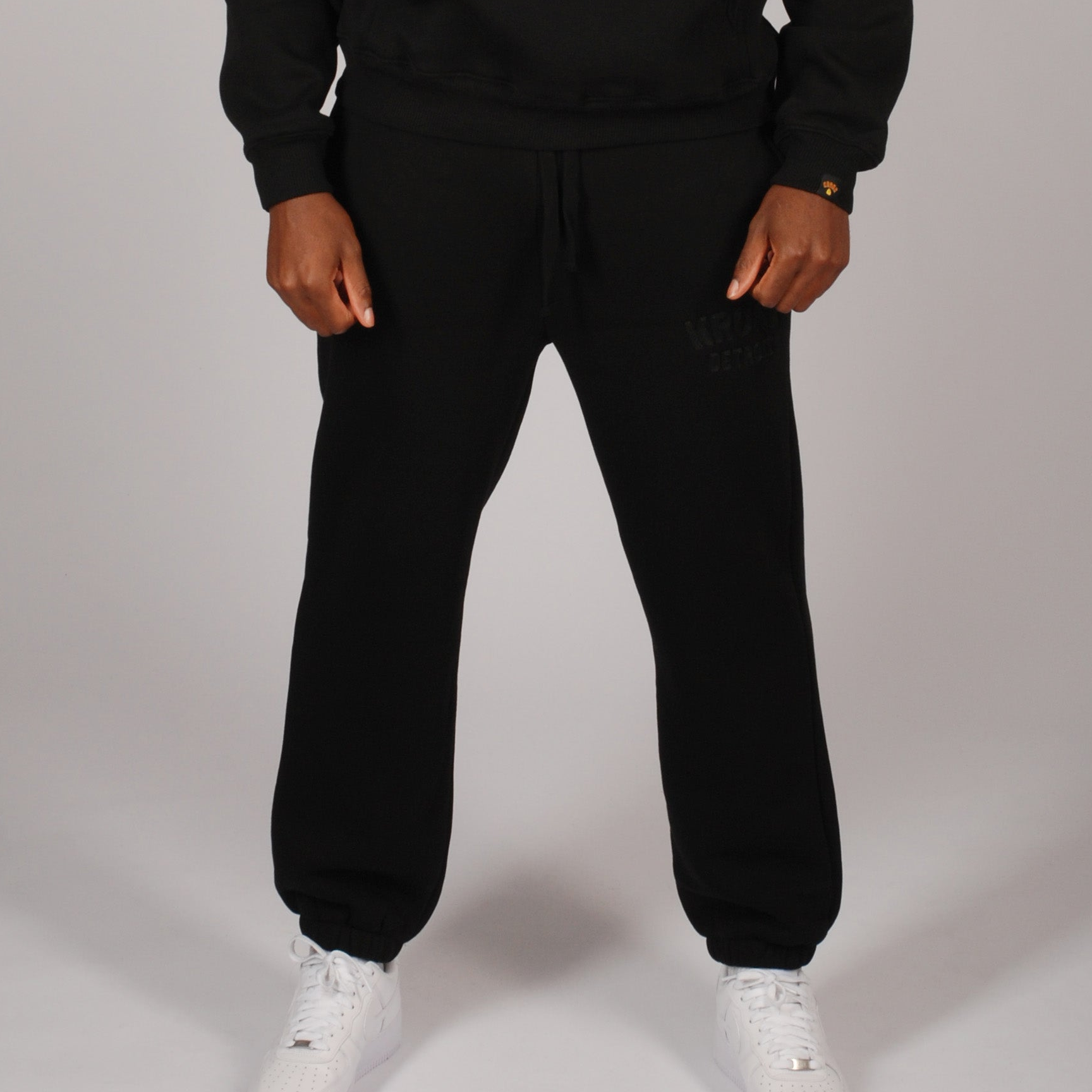 Finished in all-black with tonal Detroit chain stitch appliqué on the back leg, self-coloured drawcords, and KRONK’s signature pocket tab label, these joggers deliver understated confidence with deep boxing heritage.